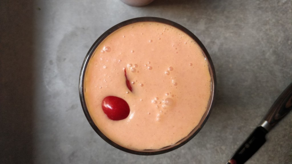 Para hacerlo un poco más entretenido, añadí un par de cerezas descorazonadas al batido. El sabor un poco más ácido de las cerezas combinó a la perfección con el batido.