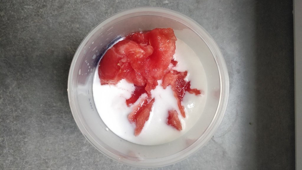 Yo encontré el equilibrio perfecto usando 400 ml de leche de coco y unos 800 gramos de sandía, con una cucharadita de extracto de vainilla.