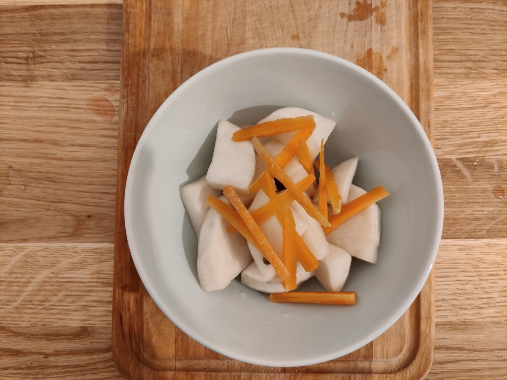 En Asia, normalmente se utiliza el nabo Daikon, también llamado rábano blanco o rábano japonés. Puedes utilizar cualquier variedad de nabo o rábano. Por cierto, preparé demasiado escabeche, así que lo utilicé para encurtir rábanos.